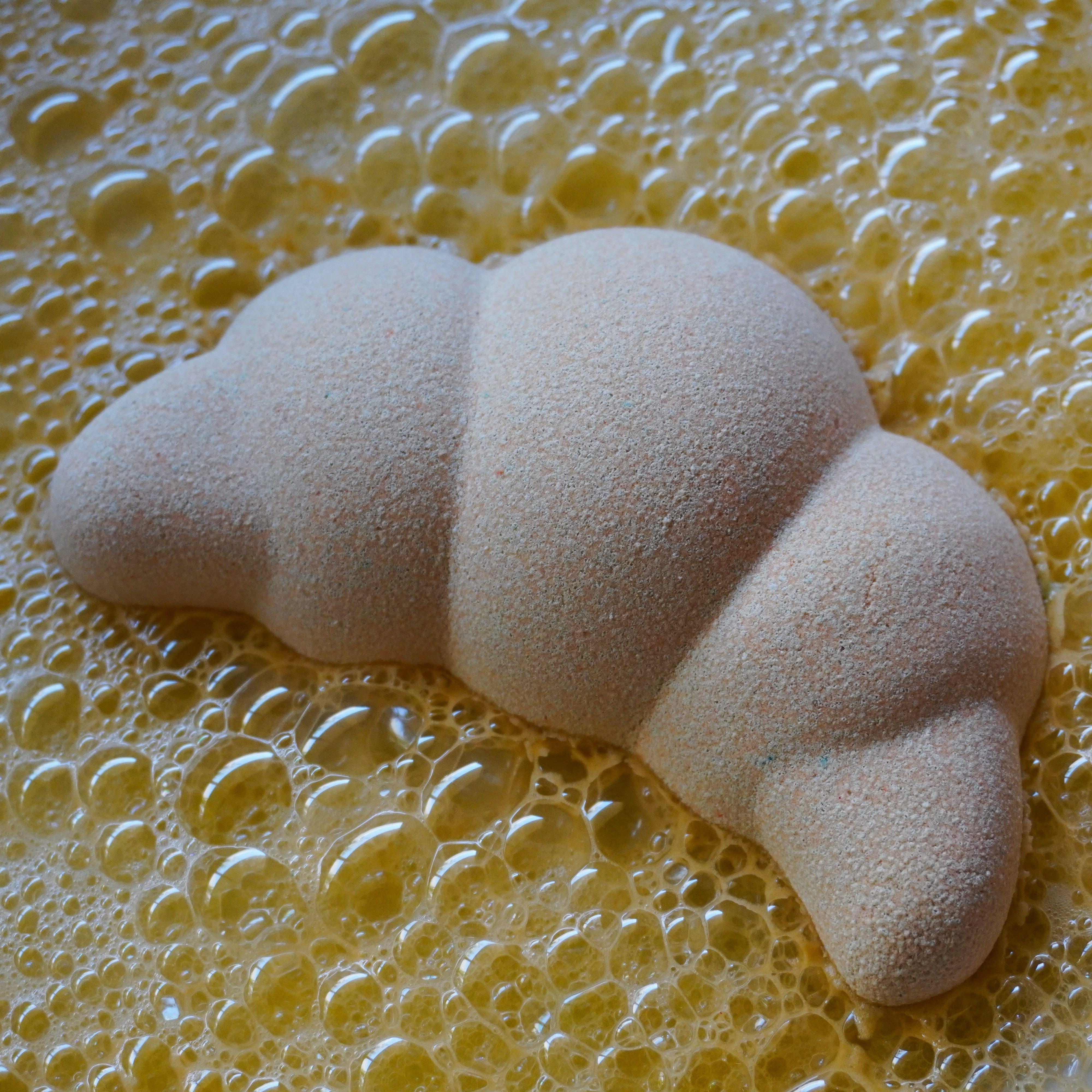 This orange and yellow croissant bath bomb melts into a warm, uplifting bath with swirls of colour and fragrance.